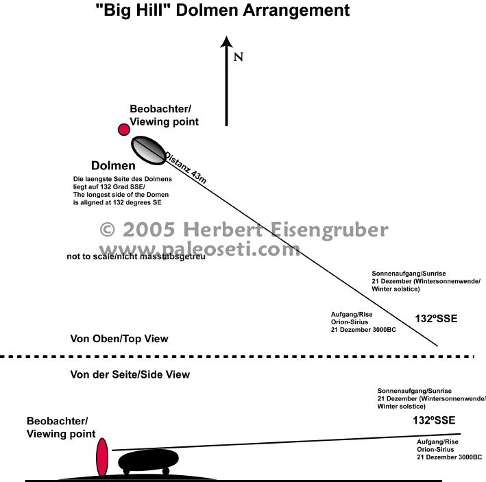 longest side of the Dolmen is aligned to 132 degrees SSW. Regarding